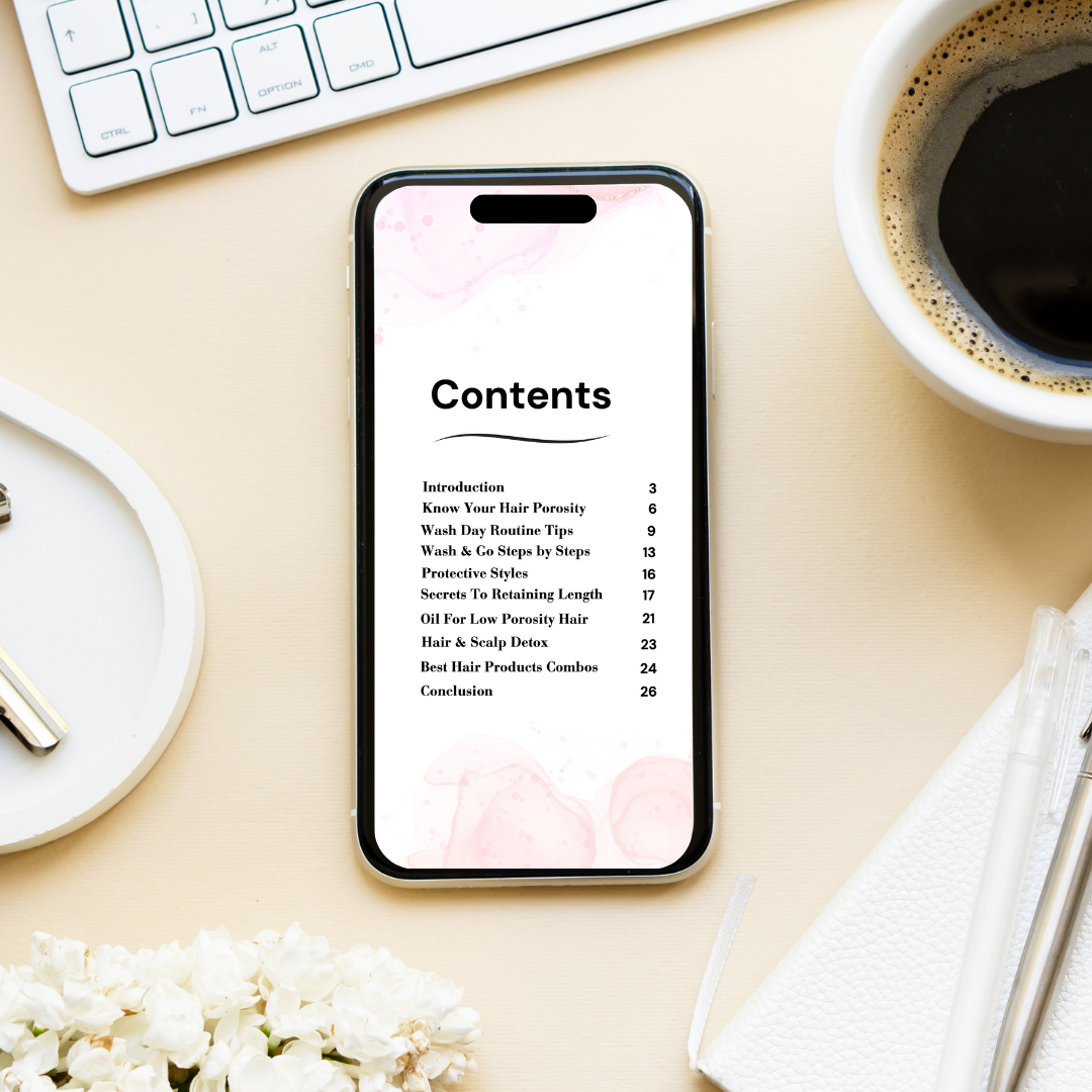 Get the ultimate roadmap for caring for low porosity hair! You need this ebook if you've ever felt like your low porosity hair just won’t cooperate—whether it’s refusing to absorb moisture or always feeling weighed down by heavy products. This guide breaks down every step of your hair care routine—from washing to deep conditioning—ensuring that your hair stays hydrated, soft, and strong. Learn how to solve common hair problems like product buildup, dryness, and difficulty finding the right products. Whether you're a newbie to natural hair care or looking to refine your routine, this ebook has everything you need to promote growth, moisture, and manageability. Perfect for anyone looking to transform their hair journey!